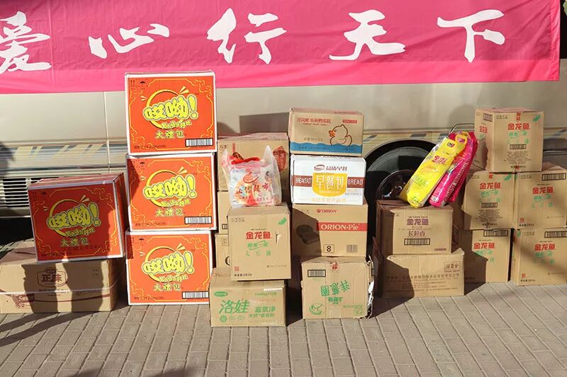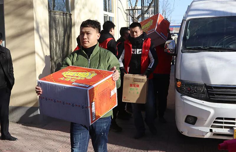 2018年2月5日上午,爱心商家在优艺藤教育基地门前集合,将为老人们准备的米、油、面和糕点等装上车,驱车前往霸州市中心敬老院。